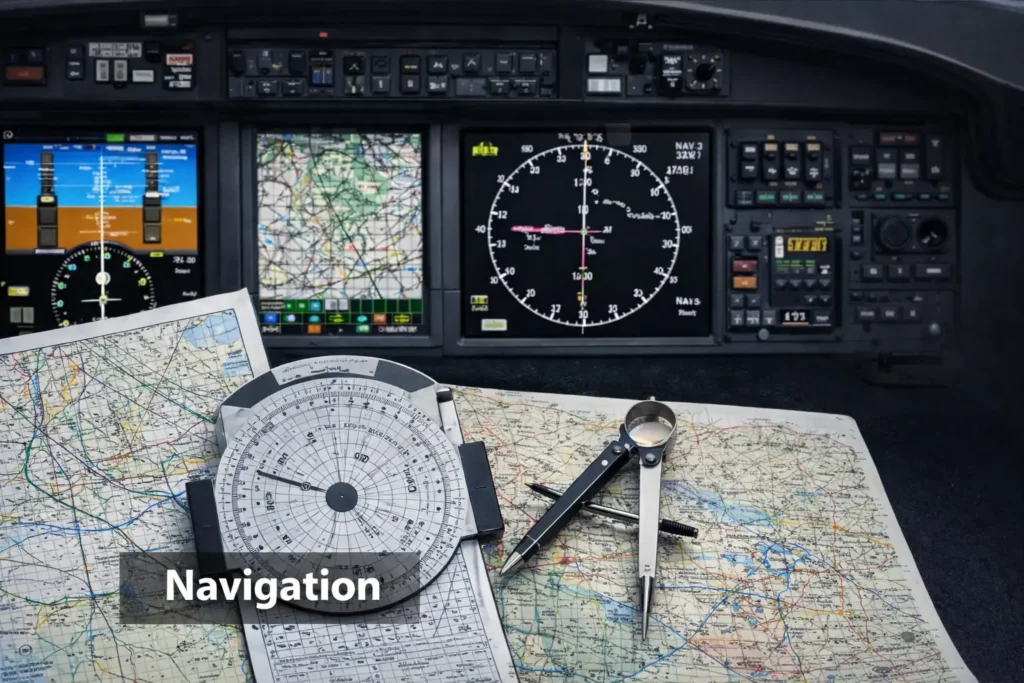 Navigation teaches how to plan and conduct a flight from departure to destination accurately. It covers maps and charts, latitude and longitude, time, speed, distance calculations, dead reckoning, radio navigation aids (ADF, VOR, DME, GPS), great circle and rhumb line tracks, and flight planning techniques.