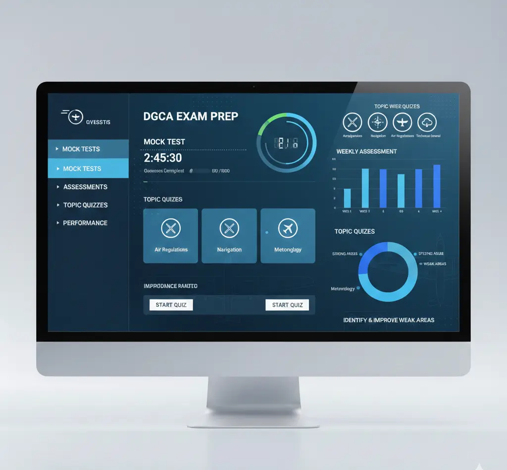 DGCA pattern-based model mock tests, weekly assessments, and topic-wise quizzes with detailed performance analysis. Helps identify weak areas and improve exam confidence.